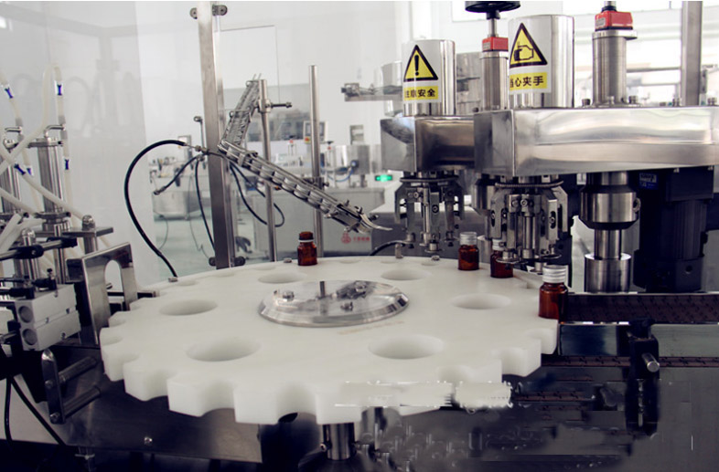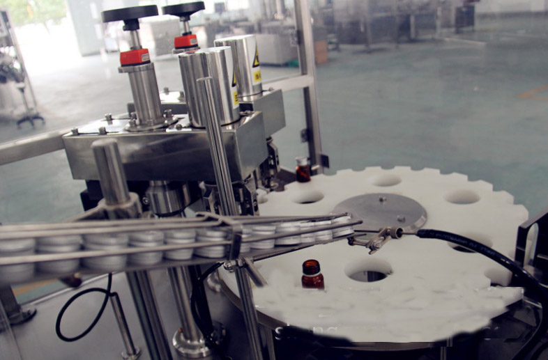 該西林瓶灌裝壓塞鎖蓋機集自動進瓶、理蓋、上蓋、抽吸真空、旋蓋、出瓶于一體,生產效率高,運行穩(wěn)定可靠;西林瓶灌裝壓塞鎖蓋機的真空度可按需要設定,使用旋合式旋蓋原理和全密封真空式結構;該西林瓶灌裝壓塞鎖蓋機自動化程度高,設計合理,主要是由瓶子輸送、理蓋、夾瓶掛蓋、旋蓋、電控等機構和抽真空系統(tǒng)組成;此西林瓶灌裝壓塞鎖蓋機能耗低、適應性好,旋蓋機構高度可調節(jié),適應相同口徑、不同高度的瓶子旋蓋;更換部分零件即可實現(xiàn)不同瓶徑、不同口徑的旋蓋,更換快捷方便;夾瓶子的托爪帶有膠墊,真空罩、旋蓋、配蓋機構都是氣缸驅動,在使用過程中都能做出精確調整,動作靈活;送蓋機構有光電感應安全保護裝置,可實現(xiàn)無蓋開機送蓋,蓋滿關機不送蓋;
