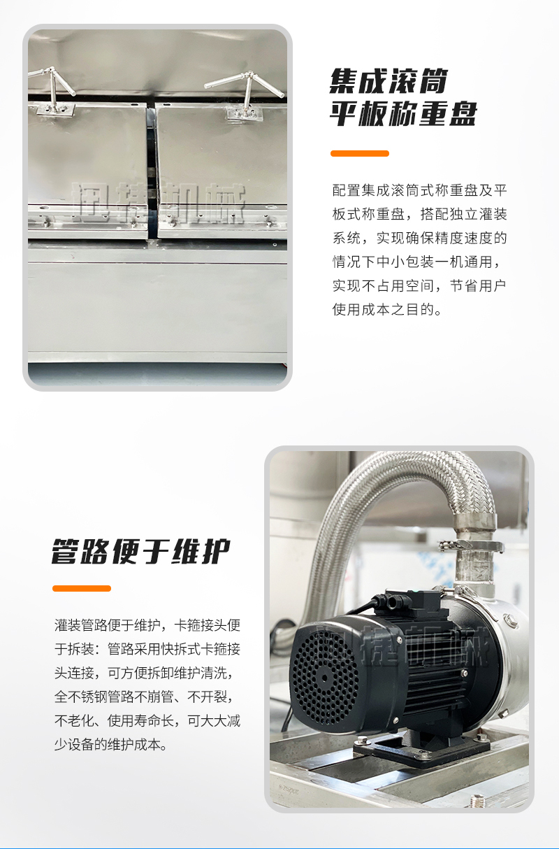 5.集成滾筒、平板稱重盤,一機多用,方便快捷:配置集成滾筒式稱重盤及平板式稱重盤,搭配獨立灌裝系統,實現確保精度速度的情況下中小包裝一機通用,實現不占用空間,節省用戶使用成本之目的。